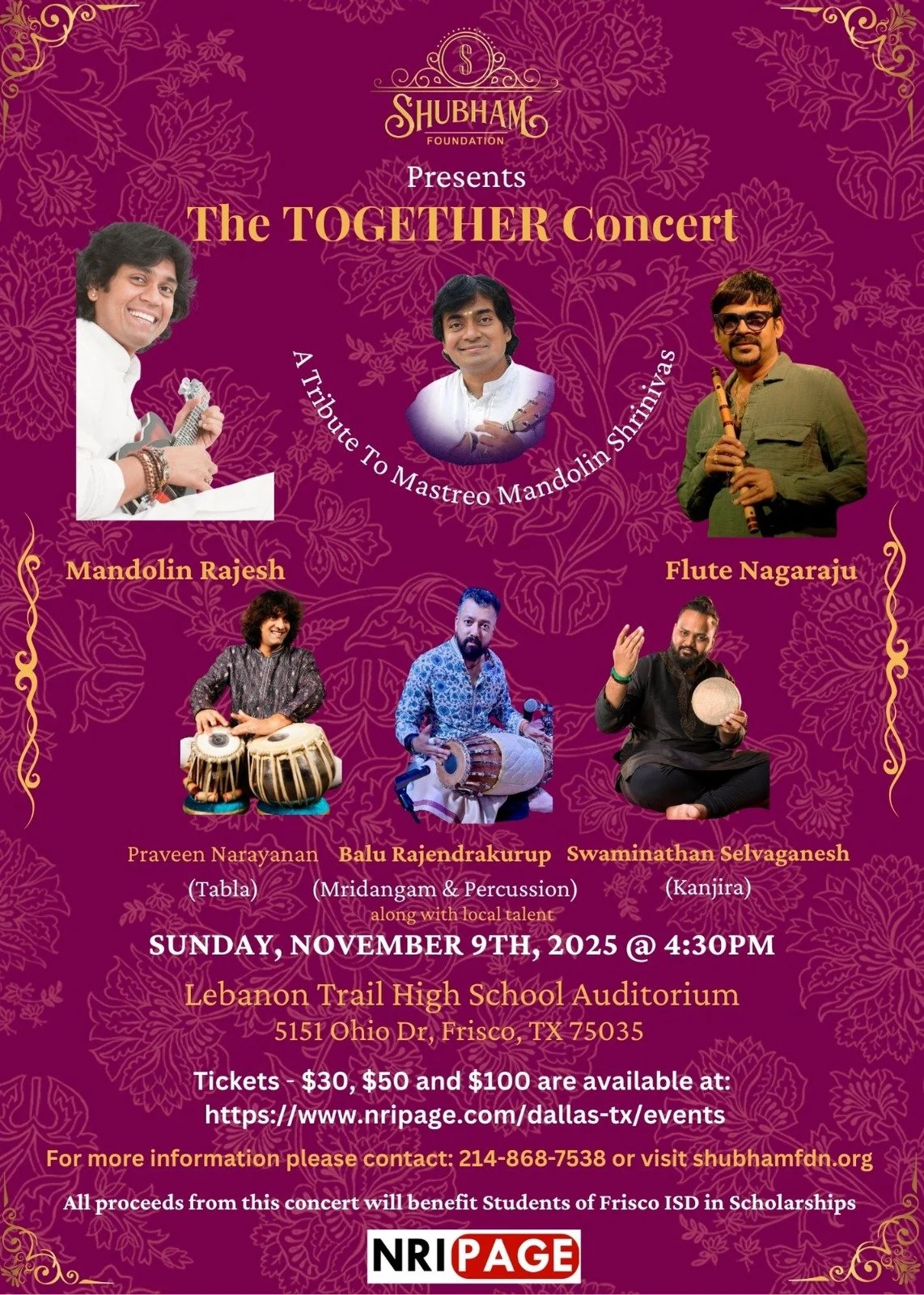 Join us for an unforgettable evening of soulful music as we pay tribute to the legendary Maestro Mandolin. Shrinivas. This special concert brings together world-renowned artists for a unique musical journey that celebrates tradition, talent, and togetherness.