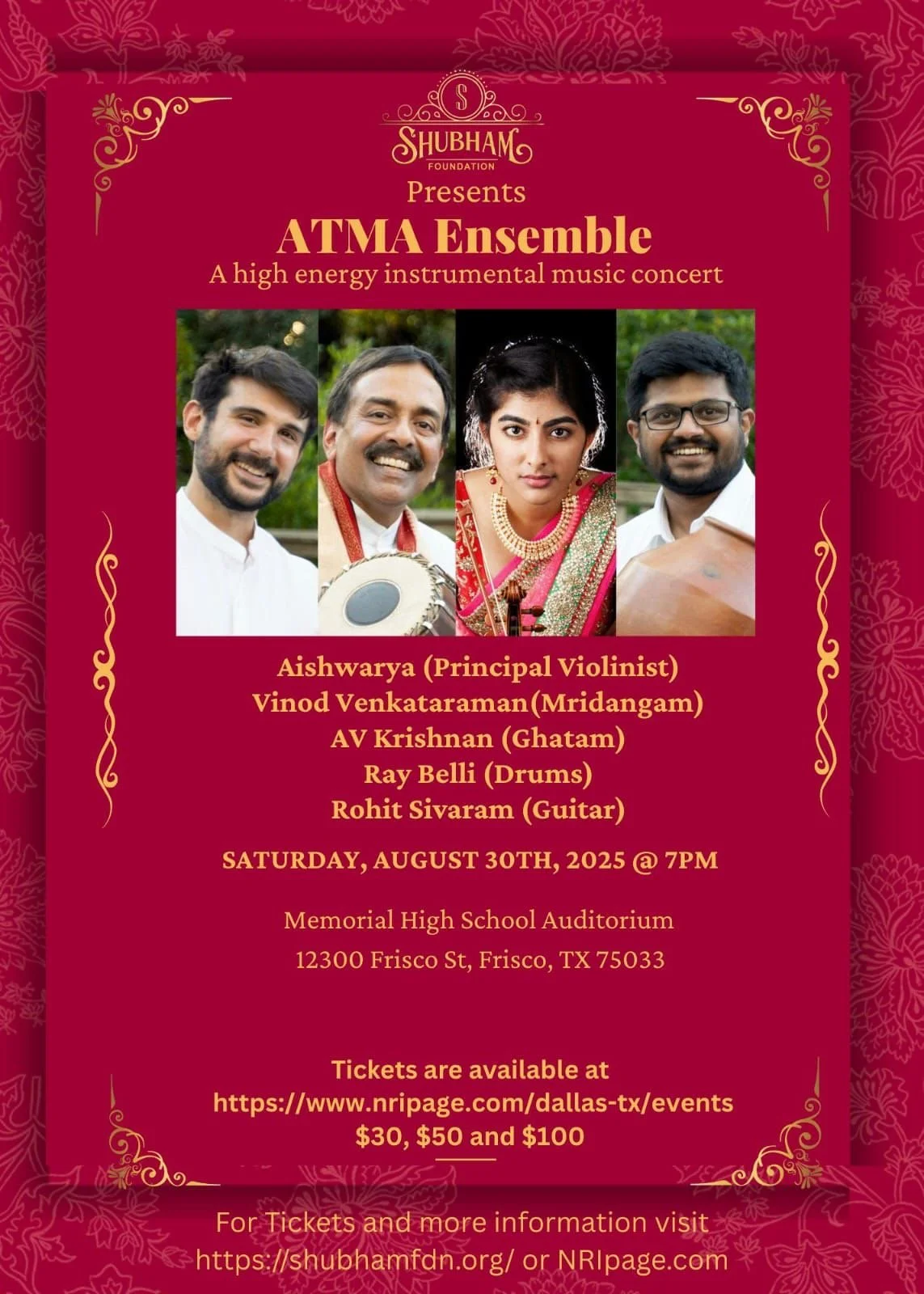 Back to All Events ATMA Ensemble Saturday, August 30, 2025 7:00 PM 9:00 PM Memorial High School Auditorium 12300 Frisco Street Frisco, TX, 75033 United States (map) Google Calendar ICS Buy Tickets